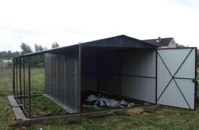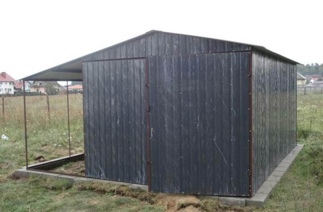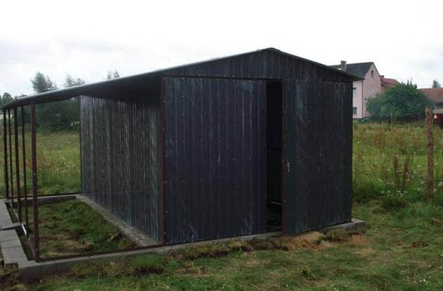 Garaż 3,0m x 5,0m o konstrukcji wykonanej z kątowników zimnogietych zabezpieczonych farbą podkładową „minią” koloru czerwonego. Konstrukcja poszyta jest blachą trapezową akrylową w kolorze ciemnobrązowym (kolorystyka dowolna według potrzeb klienta) pierwszego gatunku, przytwierdzoną za pomocą nitów aluminiowych do szkieletu garażu. Garaż blaszany posiada dach dwuspadowy gdzie wysokość ścian bocznych wynosi 2,13m, wysokość światła wjazdu 2,0m, oraz wysokość szczytu 2,45m. Wyprodukowane elementy boczne, tył , przód wraz z bramą wjazdową łączone są za pomocą śrub. Jako ostatnim elementem montażowym by garaż stanowił całość instalowany jest dach dwuspadowy osadzony na kratownicy oraz poprzeczkach z ceownika połączonych do ścian bocznych. Garaż posiada bramę wjazdowa dwuskrzydłową o wymiarach 3m szerokości i 2 metry wysokości, zaopatrzona w zamek w prawym skrzydle, dwa otwory pod kłódkę oraz rygle w lewym skrzydle. Z lewej strony dołączone zostało same zadaszenie bez blachy o szerokości 2,0m i długości 5,0m Garaż wykonany jest z odpowiednio dobranych materiałów które zapewniają odpowiednia jakość, trwałość oraz funkcjonalność na najwyższym poziomie. Ze względu na indywidualne potrzeby wykonujemy garaże według projektu klienta o dowolny wymiarach z bardzo bogatą bazą elementów dodatków.