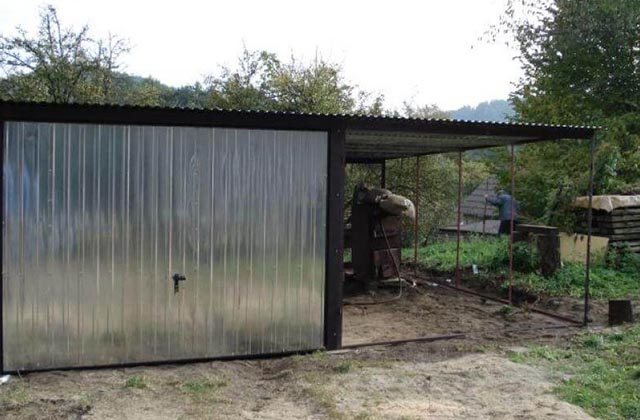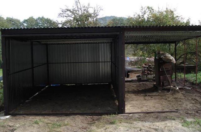 Garaż 3,0m x 5,0m o konstrukcji wykonanej z kątowników zimnogietych zabezpieczonych farbą podkładową „minią” koloru czerwonego. Konstrukcja poszyta jest blachą trapezową ocynkowaną (kolorystyka dowolna według potrzeb klienta) pierwszego gatunku, przytwierdzoną za pomocą nitów aluminiowych do szkieletu garażu Garaż posiada następujące parametry wysokościowe: Wysokość z przodu 2,13m, wysokość światła wjazdu 2,0m, oraz wysokość tyłu 1,90m. Wyprodukowane elementy boczne, tył , przód wraz z bramą wjazdową łączone są za pomocą śrub. Jako ostatnim elementem montażowym by garaż stanowił całość instalowany jest dach ze spadkiem do tyłu osadzony na poprzeczkach z ceownika połączonych do ścian bocznych. Garaż posiada bramę wjazdowa podnoszoną do góry o wymiarach 3m szerokości po otwarciu 2,70m) i 2 metry wysokość ( po otwarciu 1,94m) posiadająca zamek z klamka. Z prawej strony garażu dołączone jest zadaszenie o wymiarach 3,0m szerokości i 5,0 m wysokości. Garaż wykonany jest z odpowiednio dobranych materiałów które zapewniają odpowiednia jakość, trwałość oraz funkcjonalność na najwyższym poziomie. Ze względu na indywidualne potrzeby wykonujemy garaże według projektu klienta o dowolny wymiarach z bardzo bogatą bazą elementów dodatków. Inwestycja została zrealizowana w województwie kujawsko-pomorskim.