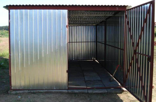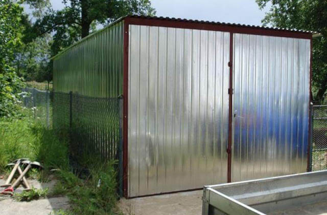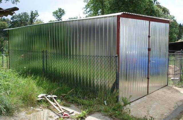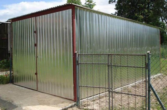 Garaż 3,0m x 6,0m o konstrukcji wykonanej z kątowników zimnogietych zabezpieczonych farbą podkładową „minią” koloru czerwonego. Konstrukcja poszyta jest blachą trapezową ocynkowaną (kolorystyka dowolna według potrzeb klienta) pierwszego gatunku, przytwierdzoną za pomocą nitów aluminiowych do szkieletu garażu Garaż posiada następujące parametry wysokościowe: Wysokość z przodu 2,13m, wysokość światła wjazdu 2,0m, oraz wysokość tyłu 1,90m. Wyprodukowane elementy boczne, tył , przód wraz z bramą wjazdową łączone są za pomocą śrub. Jako ostatnim elementem montażowym by garaż stanowił całość instalowany jest dach ze spadkiem do tyłu osadzony na poprzeczkach z ceownika połączonych do ścian bocznych. Garaż posiada bramę wjazdowa dwuskrzydłową o wymiarach 3m szerokości i 2 metry wysokość posiadająca zamek w prawym skrzydle, dwa otwory pod kłódkę oraz rygle w lewym skrzydle. Garaż wykonany jest z odpowiednio dobranych materiałów które zapewniają odpowiednia jakość, trwałość oraz funkcjonalność na najwyższym poziomie. Ze względu na indywidualne potrzeby wykonujemy garaże według projektu klienta o dowolny wymiarach z bardzo bogatą bazą elementów dodatków.