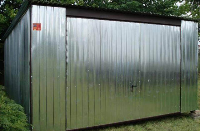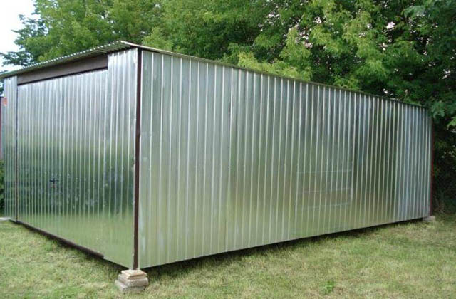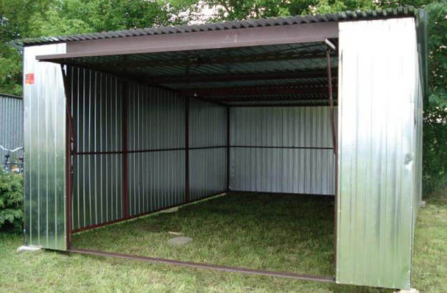 Garaż 4,0m x 5,0m o konstrukcji wykonanej z kątowników zimnogietych zabezpieczonych farbą podkładową „minią” koloru czerwonego. Konstrukcja poszyta jest blachą trapezową ocynkowaną (kolorystyka dowolna według potrzeb klienta) pierwszego gatunku, przytwierdzoną za pomocą nitów aluminiowych do szkieletu garażu Garaż posiada następujące parametry wysokościowe: Wysokość z przodu 2,13m, wysokość światła wjazdu 2,0m, oraz wysokość tyłu 1,90m. Wyprodukowane elementy boczne, tył , przód wraz z bramą wjazdową łączone są za pomocą śrub. Jako ostatnim elementem montażowym by garaż stanowił całość instalowany jest dach ze spadkiem do tyłu osadzony na poprzeczkach z ceownika połączonych do ścian bocznych. Garaż posiada bramę wjazdowa dwuskrzydłową o wymiarach 3m szerokości i 2 metry wysokości, posiadająca zamek patentowy w prawym skrzydle, dwa otwory pod kłódkę oraz rygle w lewym skrzydle. Jak widać na zdjęciu garaż posiada pomieszczenie gospodarcze o szerokości 1,5m i 5,0 m długości z drzwiami na zamek o szerokości 1,5m. Miedzy garazem a pomieszczeniem gospodarczym nie ma żadnej ściany działowej natomiast wystepuje kratownica wykonana z ceowników oraz kontowników. Garaż wykonany jest z odpowiednio dobranych materiałów które zapewniają odpowiednia jakość, trwałość oraz funkcjonalność na najwyższym poziomie. Ze względu na indywidualne potrzeby wykonujemy garaże według projektu klienta o dowolny wymiarach z bardzo bogatą bazą elementów dodatków.
