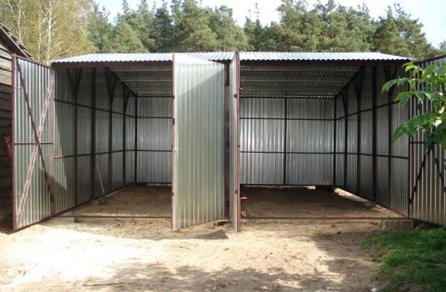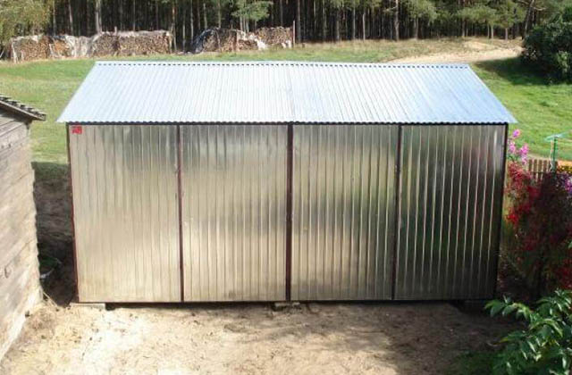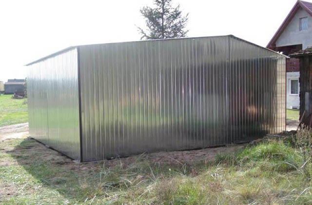 Garaż 7,0m x 5,0m o konstrukcji wykonanej z kątowników zimnogietych zabezpieczonych farbą podkładową „minią” koloru czerwonego. Konstrukcja poszyta jest blachą trapezową ocynkowaną (kolorystyka dowolna według potrzeb klienta) pierwszego gatunku, przytwierdzoną za pomocą nitów aluminiowych do szkieletu garażu Garaż posiada następujące parametry wysokościowe: Wysokość w szczycie 2,65m, wysokość światła wjazdu 2,0m, oraz wysokość przodu i tyłu to 2,13m. Wyprodukowane elementy boczne, tył , przód wraz z bramą wjazdową łączone są za pomocą śrub. Jako ostatnim elementem montażowym by garaż stanowił całość instalowany jest dach dwuspadowy asymetryczny (przód, tył) osadzony na poprzeczkach z ceownika połączonych do ścian bocznych oraz do kratownicy podtrzymującej dach. Garaż posiada dwie bramy wjazdowe dwuskrzydłowe o wymiarach 3m szerokości i 2 metry wysokości, posiadające zamek w prawym skrzydle, dwa otwory pod kłódkę oraz rygle w lewym skrzydle. Garaż wykonany jest z odpowiednio dobranych materiałów które zapewniają odpowiednia jakość, trwałość oraz funkcjonalność na najwyższym poziomie. Ze względu na indywidualne potrzeby wykonujemy garaże według projektu klienta o dowolny wymiarach z bardzo bogatą bazą elementów dodatków.