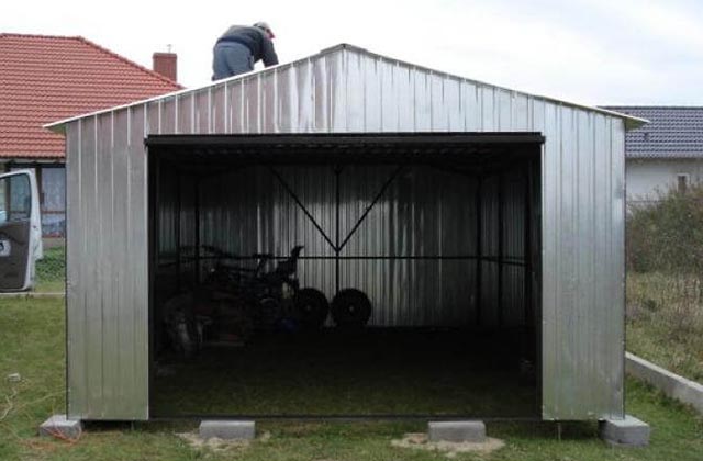 Garaż metalowy 4,0m x 6,0m pokryty blachą ocynkowaną I-go gatunku. Posiada dach dwuspadowy osadzony na kratownicy gdzie wysokość ścian bocznych wynosi 2,13m.